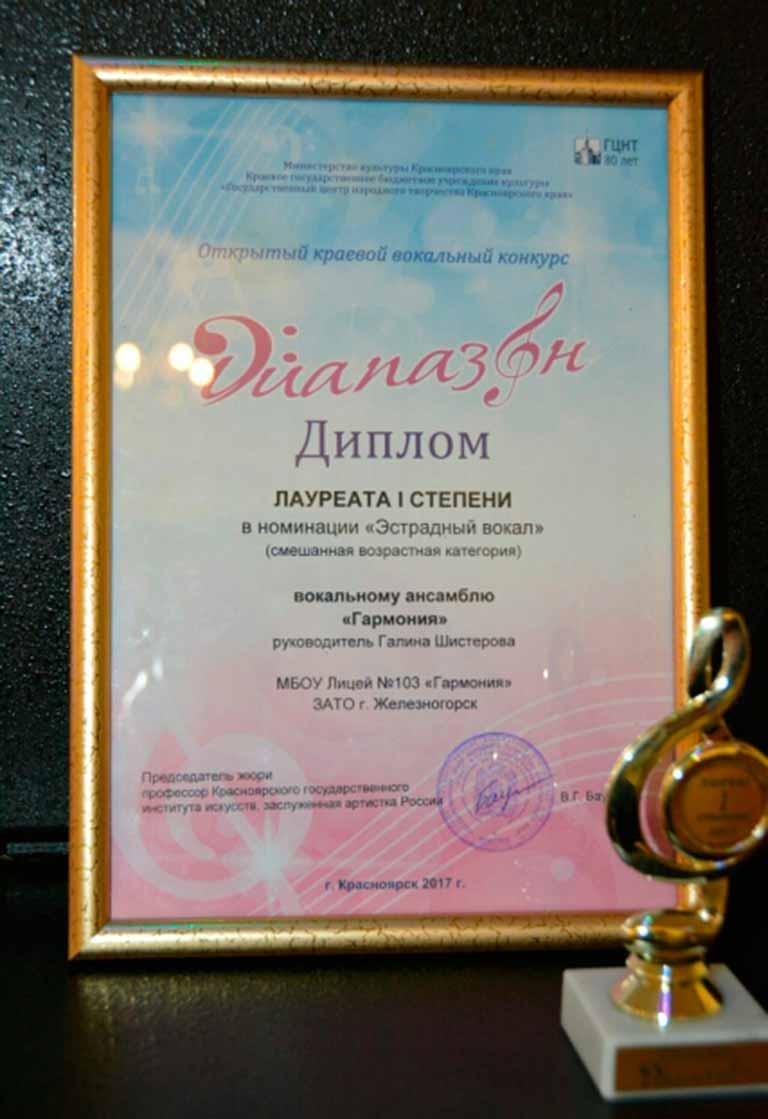 20–23 апреля 2017 года на базе Краевого государственного бюджетного учреждения культуры «Центр культурных инициатив» состоялся Открытый краевой вокальный конкурс «Диапазон», в котором под руководством Галины Шистеровой наш вокальный ансамбль «Гармония» стал Лауреат I степени!